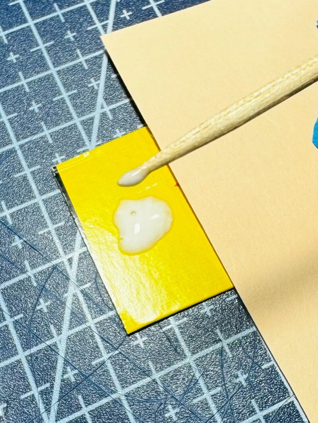 ポイントは、接着剤をつけ過ぎないこと。同封のつまようじの先に少量付けてパーツを貼ります。